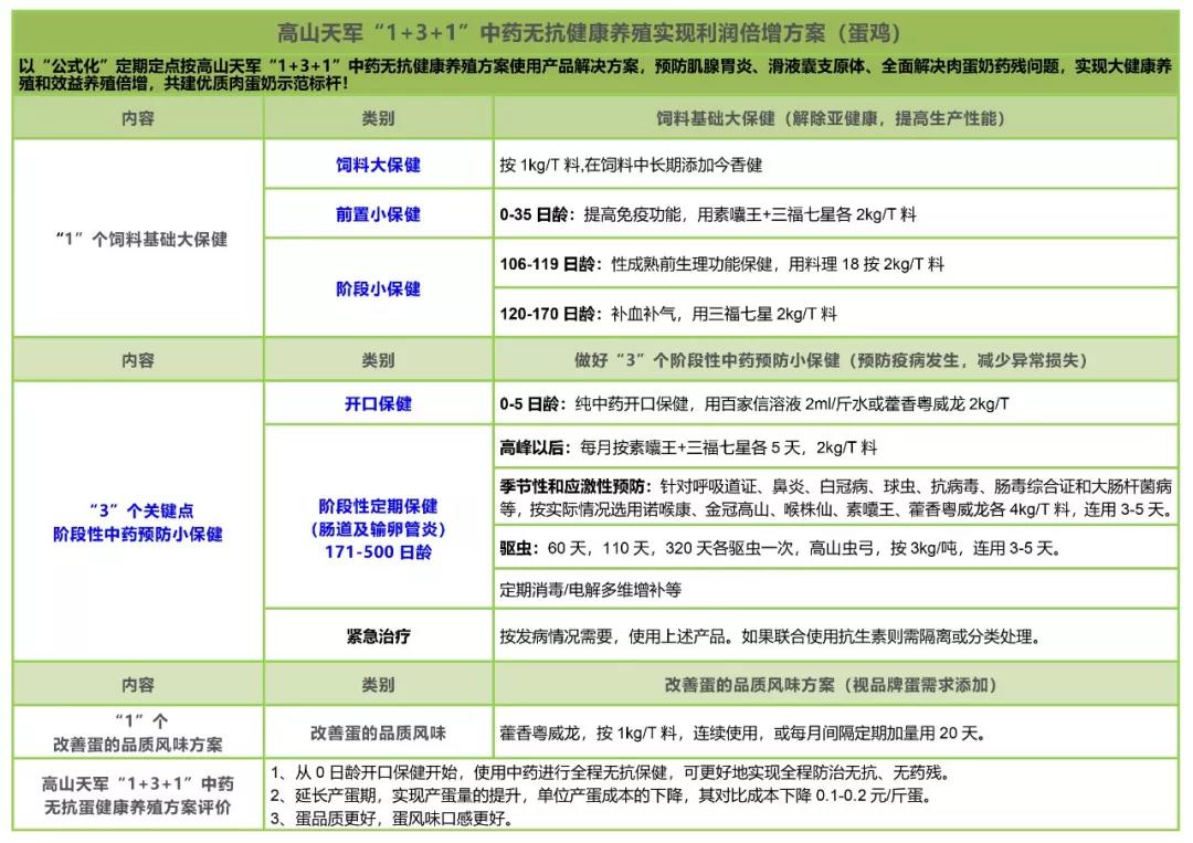 小编说:“替抗”和“无抗”都只是过程,“安全、健康、优质、品牌”才是人们的追求,以“公式化”定期定点按高山天军“1+3+1”中药无抗健康养殖方案,做好生产过程中的预防保健工作,包括做好1个饲料基础大保健,以及控制养殖利润关键点的3个小保健以及1个出栏前增重育肥方案,预防肌腺胃炎、滑液囊支原体、全面解决畜禽产品药残问题,实现大健康养殖和效益养殖倍增,共建优质肉蛋奶示范标杆!