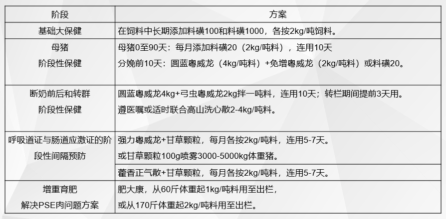 备注: 1、无抗方案成功与否取决于环境、免疫、管理三大基础是否做到位。 2、预防:根据生理结构的变化和时令给予相对应的措施;天气变化强力粤威龙2-4公斤/吨料进行预防;暑邪用正冠乐、驱虫散。 3、输卵管炎:临床免增粤威龙+温白三各2公斤/吨料,每月连用7天,免增粤威龙可以降低破蛋率。 4、蛋鸭无抗方案按上述所有产品的用量增加30%;鸽子的用量和鸭子相同;种用(种鸡和种鸭)在产蛋前按上表方案不变,产蛋后用量增加50%。 | ||