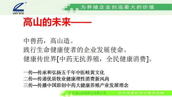 高山,创牌于1986年,一直专注于中兽药的研发与应用,始终坚持走中兽药著名品牌的发展道路。倡导“无抗使用中药,胡保畜禽健康。保障畜禽健康,实现人类安全”的 “大健康”生态养殖理念。