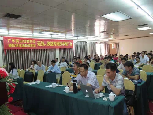 在2015华南(肇庆)畜牧业博览会启动之际,5月13日,高山集团率先在肇庆松涛宾馆举办了关于“控制核心养殖成本,实现高利润倍增——高山纯中兽药效益养殖优化方案”的技术推广会,与饲料企业、经销商、养殖场老板近100人展开讨论。