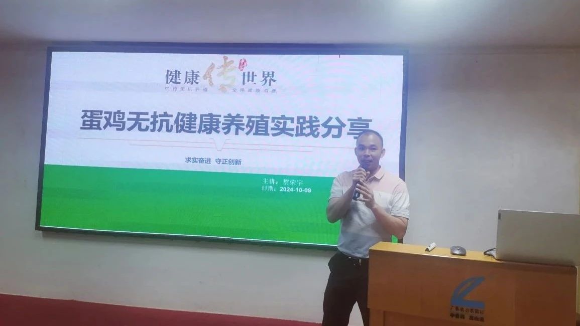 高山集团营销经理黎荣宇作《蛋鸡无抗健康养殖实践分享》 ,首先讲解要达成蛋鸡中药健康养殖的营销转化,必须本着持续为客户创造价值的指导思想来工作。同时指出蛋鸡无抗养殖遇到痛点的解决方案是在关键的日龄节点应用相应的中药预防,保障鸡群少发病、不发病。最后分享料磺1号和藿香正气口服液的应用体会,料磺1号是预防蛋鸡疾病的有力保障;藿香正气口服液针对解暑、肠道抑菌、祛湿健脾。
