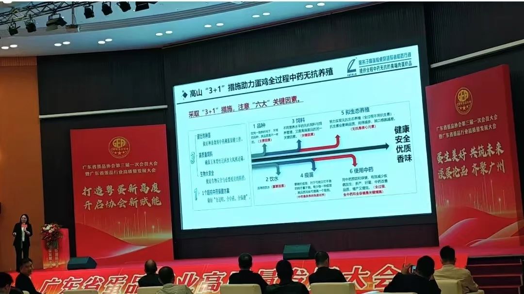 大会专家——华南农业大学谢青梅教授作《广东省蛋品行业现状与未来发展》报告,内容包括四大方面:一是广东省蛋鸡产业现状;二是广东省蛋品行业现状、问题及面临的挑战;三是广东省蛋品行业未来发展趋势;四是全过程中药无抗养殖的高端蛋品实践路径。她指出,全过程中药无抗健康养殖是实现高端蛋品的更高形式,是代表蛋品的高品、高质和高端,是高端蛋品的重要实践路径。当前,高端蛋品倍受高端消费人群的青睐,是广东蛋业走向高质量发展的新方向,是新质生产力的重要体现。会上,她重点介绍了高山“3+1"措施助力蛋鸡全过程中药无抗健康养殖的发展模式和方案,必须重点关注“品种、饮水、饲料、疫苗、生态养殖与中药保健”等六大关键因素。已经做到了全过程中药无抗健康养殖的东东蛋的蛋品特征是:从鸡只进场到蛋鸡淘汰的生产全过程无抗健康养殖,更安全,更健康,更优质,超低胆固醇含量(胆固醇含量比普通鸡蛋低45.3%),是高端蛋品的标杆。她还向大会倡议,动员在座的嘉宾企业家和养殖企业代表积极加入到《全过程中药无抗健康养殖(肉鸡、蛋鸡、生猪等)产业创新示范基地》行动中去。